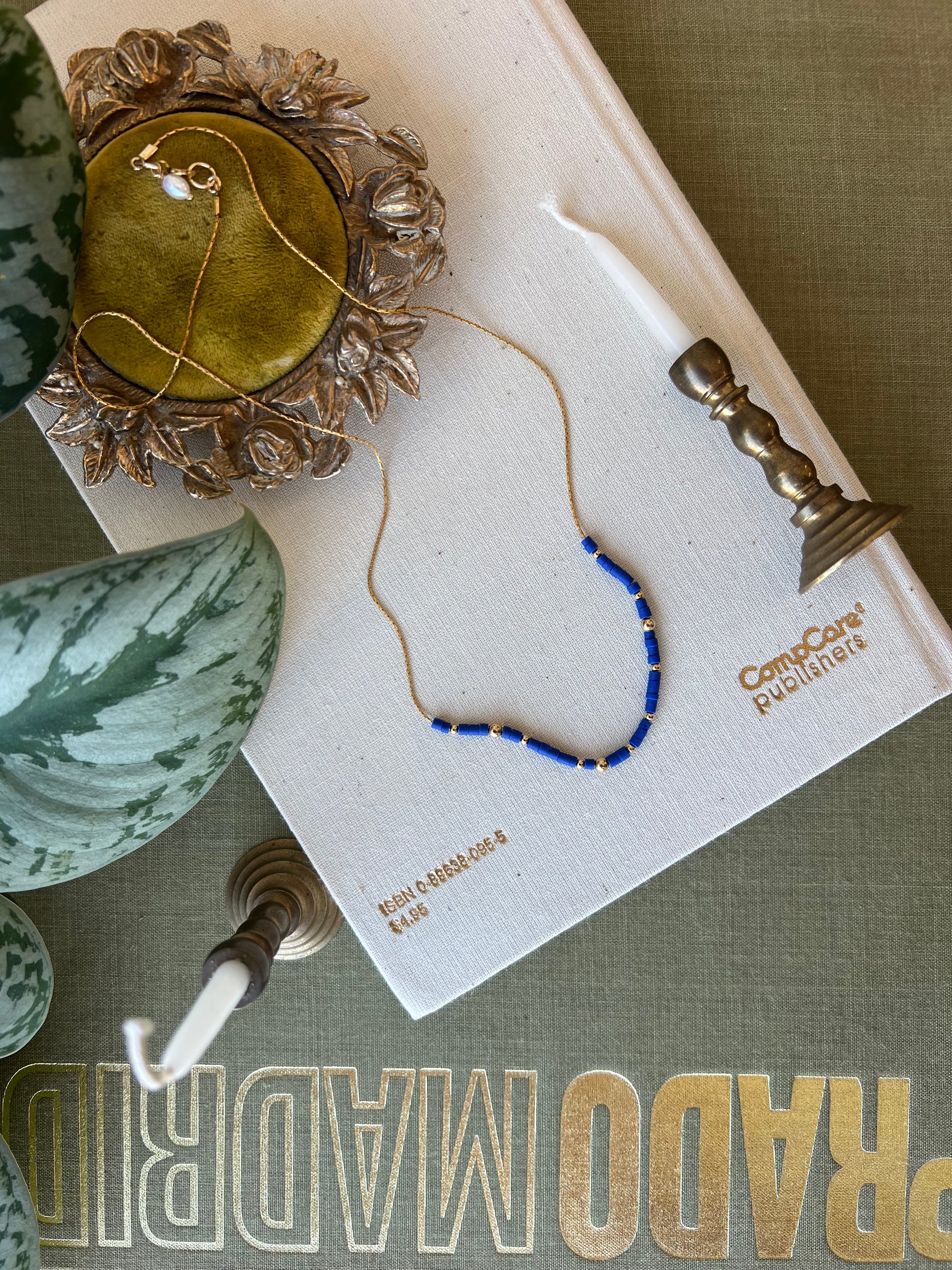 The perfect bold color for a necklace stack is lapis lazuli. Although the color may be bold, this necklace boasts a sleek and minimal profile so as to not overwhelm the wearer.