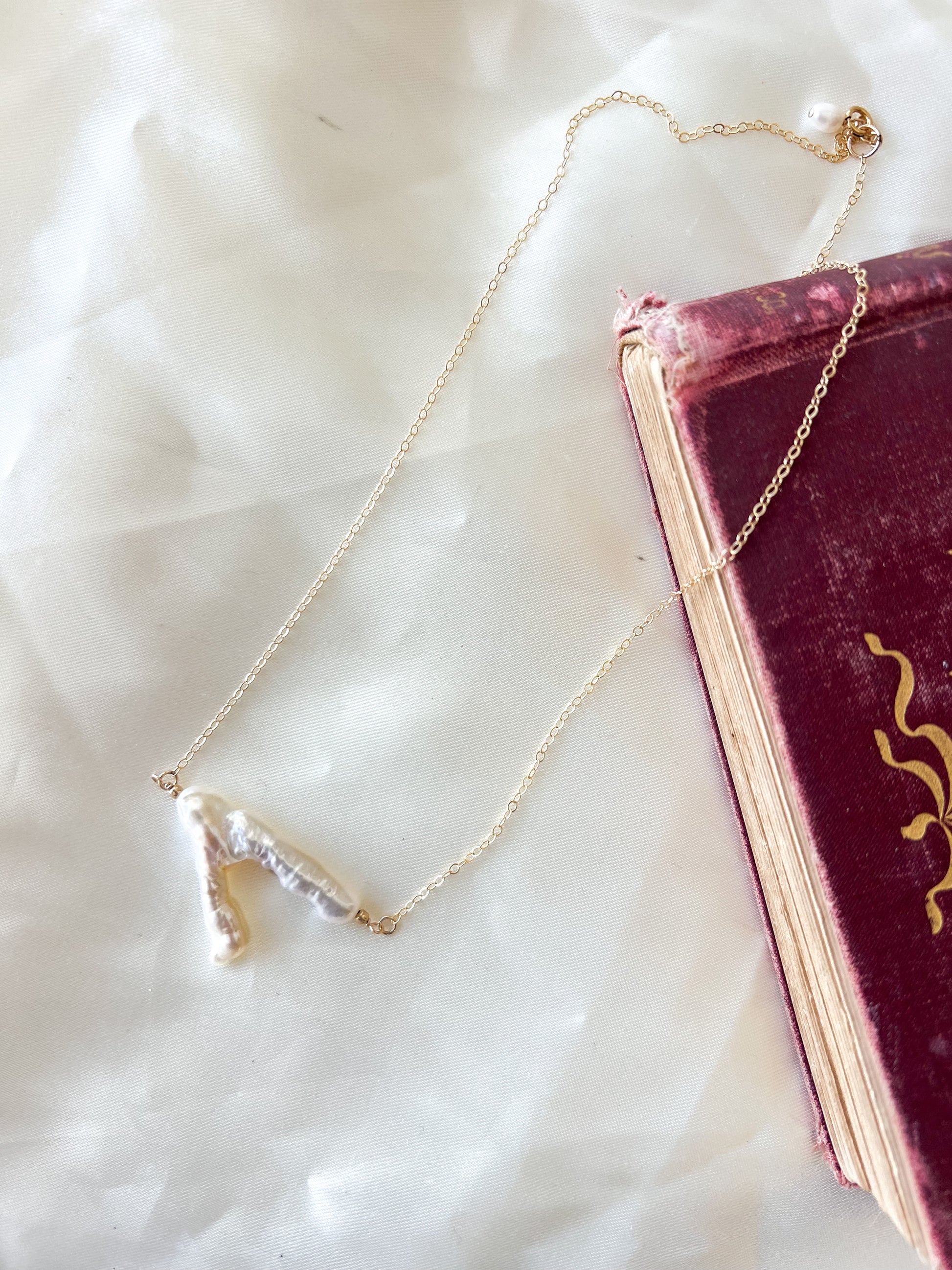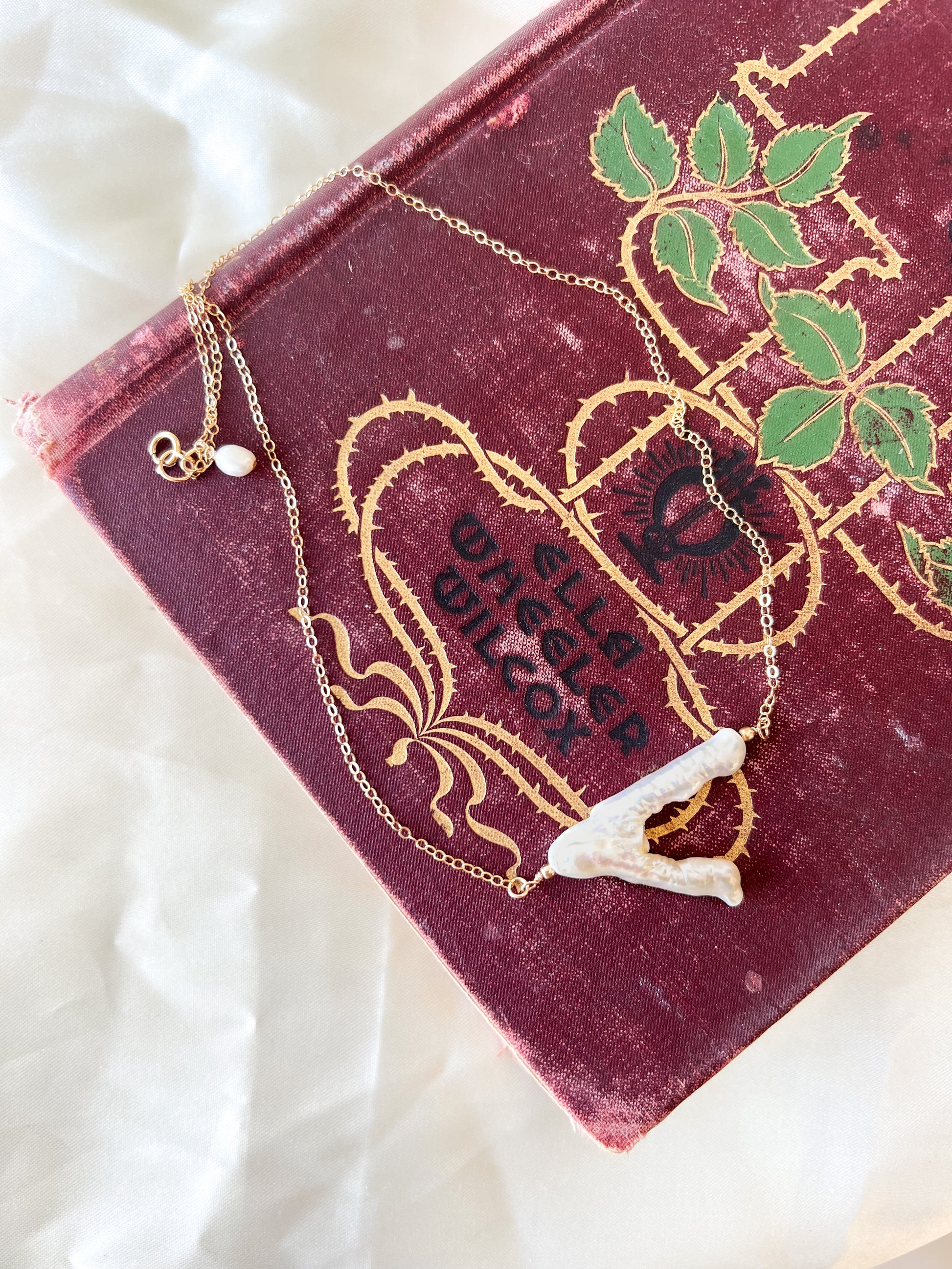 I've had this piece for a couple months now, and everyone always comments that the pearl looks like an A or V. I love how unique it is, and I hope you appreciate it as much as I do!