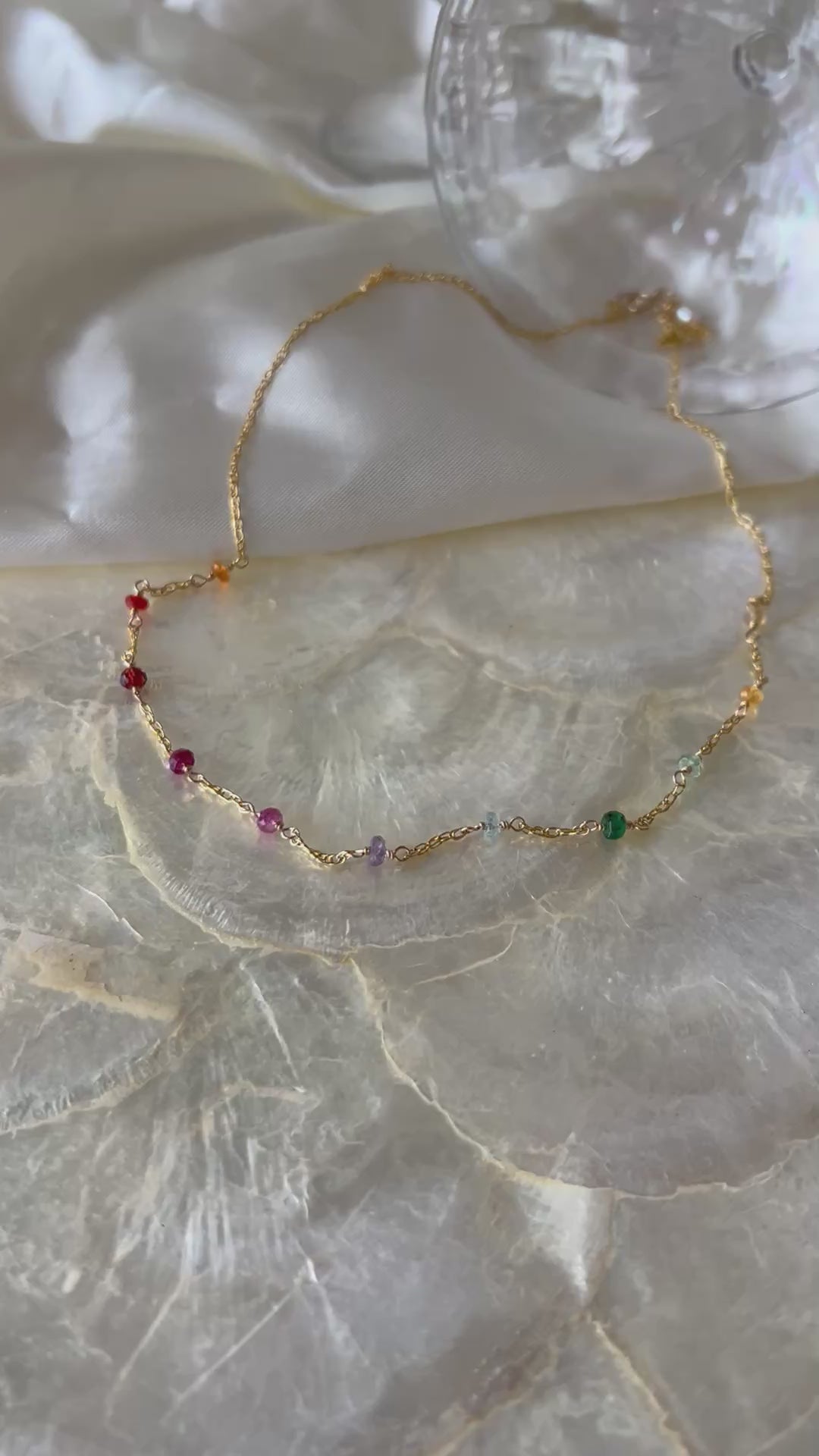 A delicate dance of color and light, this minimalist necklace is a playful yet elegant piece designed to brighten any day. A fine, barely-there chain shimmers with effortless grace, while tiny, scattered rainbow gemstones twinkle like droplets of pure joy. Each gemstone is carefully placed, adding just the right touch of color—subtle yet striking, like catching a glimpse of a rainbow after the rain. Perfect for layering or wearing solo, this necklace is a dreamy, everyday accessory that brings a little extra magic to your look. ✨🌈